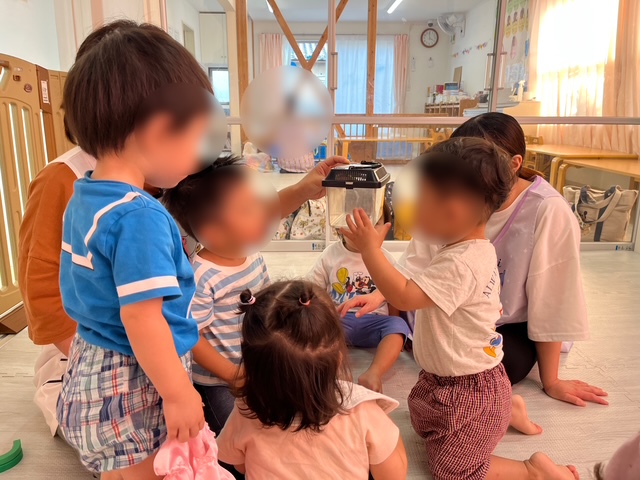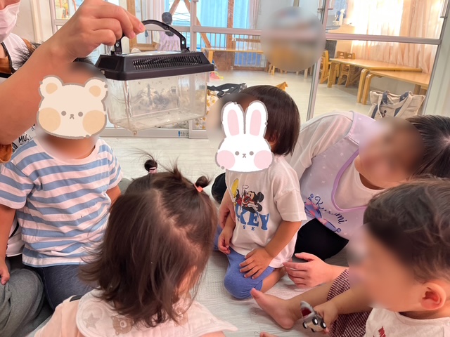 まだあまりしゃべる事のできない子どもたちですが、「あっ!」「おう!」という声を聞くたびに、虫の観察をしている今この瞬間にも子どもたちの探求心、想像力・・・色々なものが育まれているのを感じました。