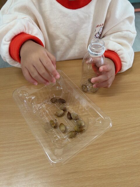 先日、1,2歳児さんが敷島公園へどんぐり拾いに出かけ、そのどんぐりを使ってマラカス作りをしました😀