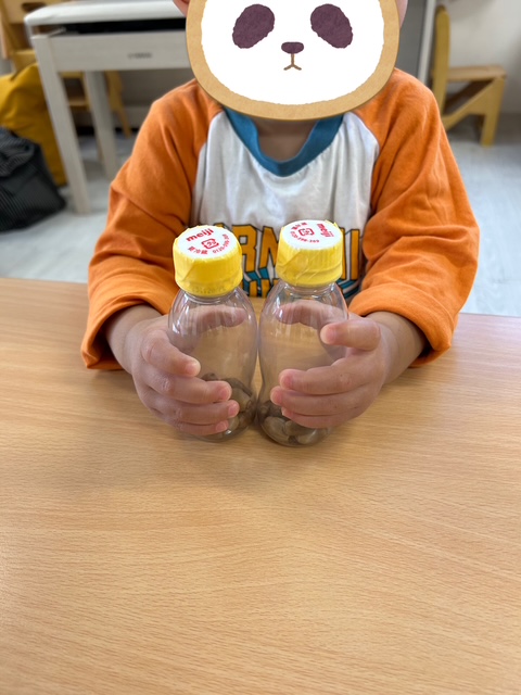 1歳児さんは、ご家庭から用意して頂いたペットボトルにどんぐりを入れました✨ふたに巻くテープの色は自分で選び、世界で一つだけの楽器が出来上がりました😀