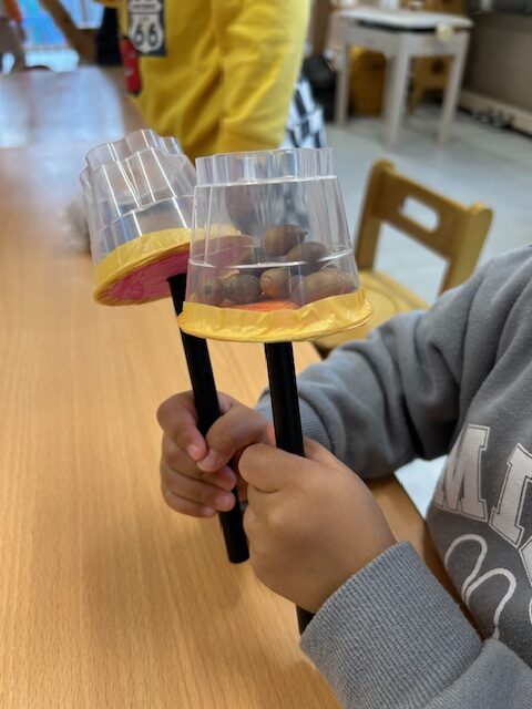 出来上がったマラカスは、ピアノの音に合わせたり、CDに合わせて体を動かしながら振ったりと、みんな楽しそうに鳴らしています♪身近などんぐりで作った楽器は、みんなのお気に入りです😀
