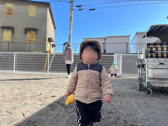 園庭に着くとかごの中からじょうろを見つけ出して「水やりいく!」とやる気満々です!