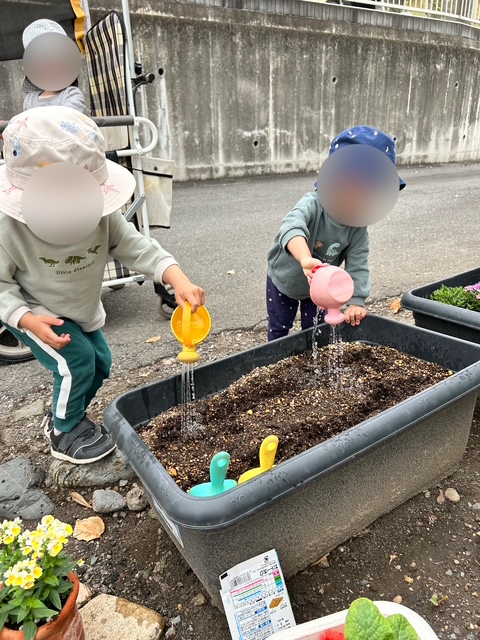 じょうろでお水をあげながら「おおきくなあれ〜」と優しく保育者と一緒に声をかけました🌈
