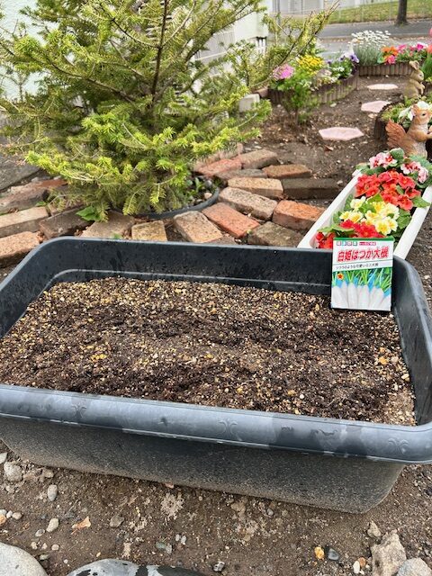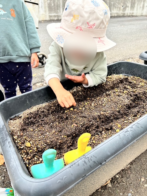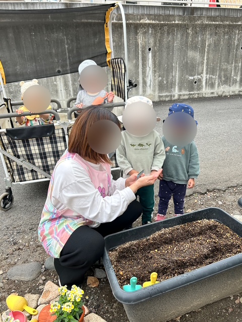 プランターに「ぱらぱら〜」と種をまくと、土の様子をのぞき込み「もっとあげたい」と言わんばかりに嬉しそうな子どもたち✨✨✨